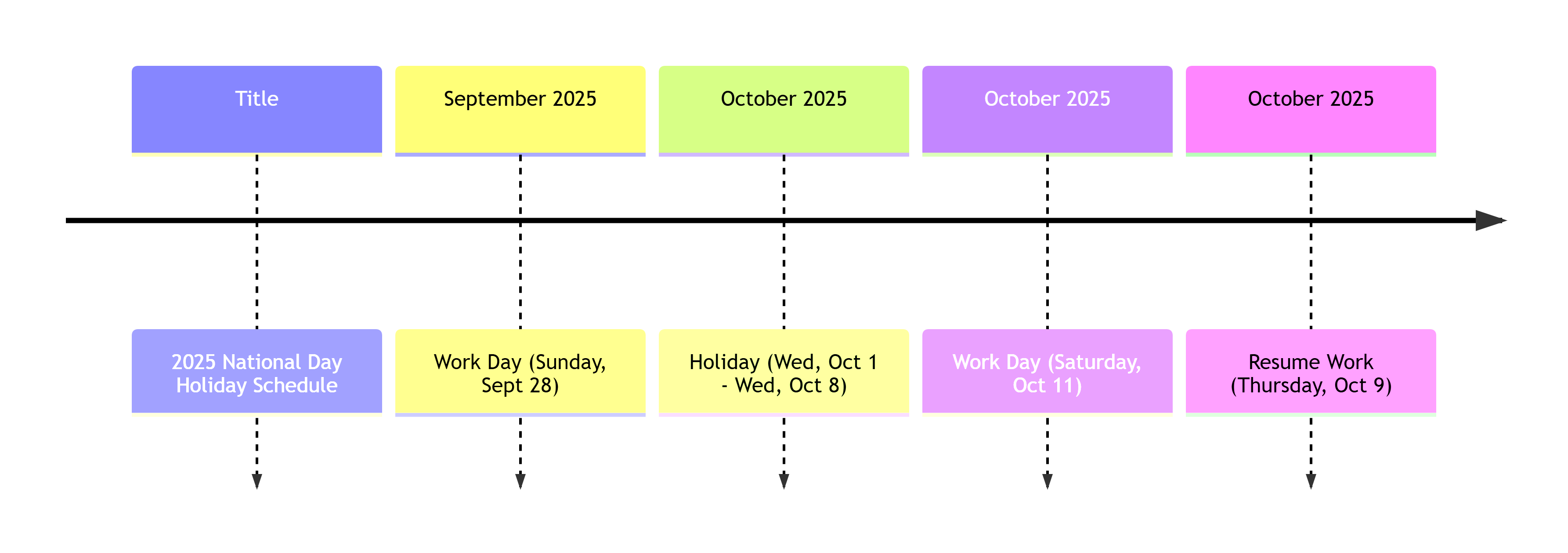 Untuk memudahkan percutian lanjutan ini, pelarasan kepada jadual kerja diperlukan. Pekerja akan bekerja pada hari Ahad, 28 September dan Sabtu, 11 Oktober.